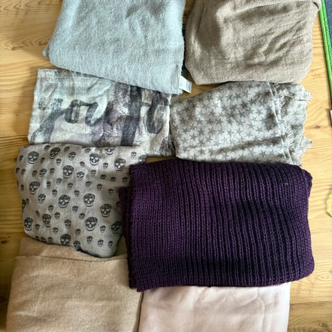 9 skjerf selge, inkluderer silkeskjerf, dyre merker og lin. Sirkelskjerf, ullskjerf og vanlige<3