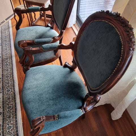 2 stk. Rokokkostoler med 1 stk. pall selges samlet for 500.