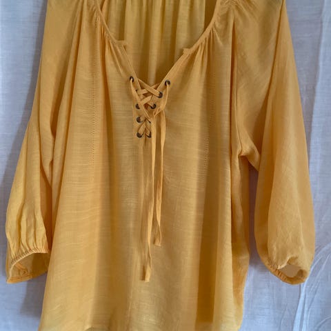 Selger en hvit kortermet (nesten uten armer) bluse med rosa/lilla striper fra Rihoas i str. M til 60 kr. Den er helt ny og ubrukt.