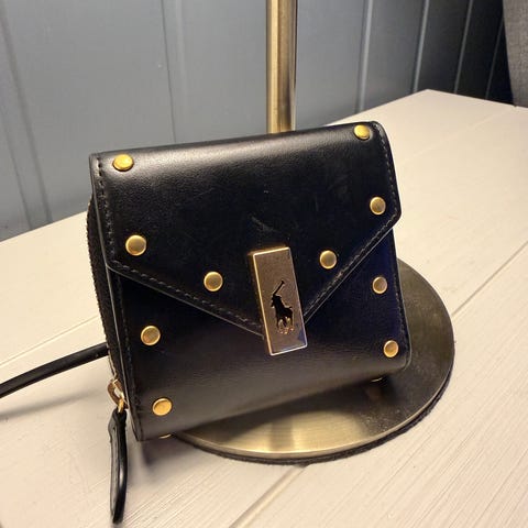 Lukkes med messingfarget glidelås, har 6 lommer for kort og en større.