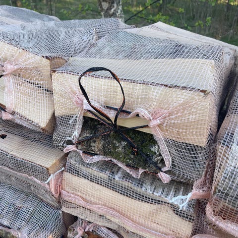 Store notsekker 1500l med 2år gammel eik og bjørkved Lagret og står inne.