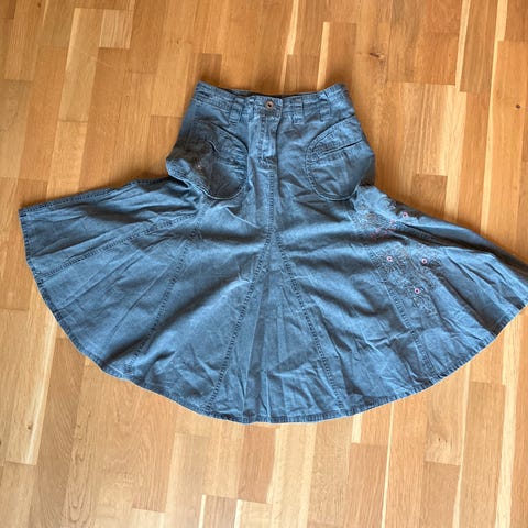 Er veldig lei for at dette er litt lite, men blir superglad om noen andre liker det og får bruk får det! Kjempefint skjørt, og fint på. Knyting i livet. Fine detaljer med lommer både foran og bak. Røffe «sårkanter» på noen av sømmene.
