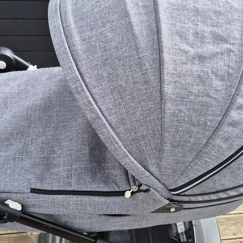 En fantastisk vogn, som vi har likt ekstra godt da vi er høye. God å trille og manøvrere, luftdekk som er gode på både asfalt og terreng. Stor og god korg under, fantastisk på shopping eller handling (eller med småsøsken og bagasje). Den er i fin stand, men begynner å se på håndtaket at den er brukt. Det gjelder ikke på sittedelen til barnet, den er like fin. Alt det grå er flekkfritt og uten nupper ol. Bagdelen er alltid brukt med laken og vognpose og/eller annen lignende beskyttelse. Sittedel har som oftest hatt vognpose. Kalesjen på begge deler har en glidelås så du kan dra den ekstra langt ned, og en glidelås med netting for god lufting. Understell har litt bruksmerker, spesielt etter vi har slått den sammen for å ha i bil. Ingen av ripene sitter dypt, kun overfladisk.