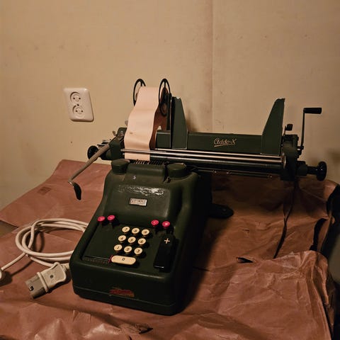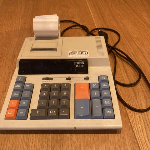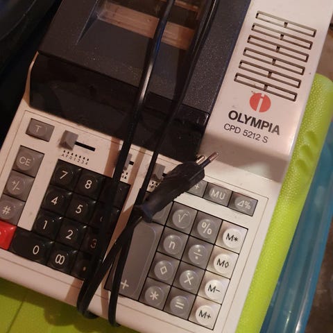 Lite brukt regnemaskin. Ingen feil, men maskinen har stått ubrukt i flere år så fargebåndet må skiftes. Selges med tre papirruller. Hentes.