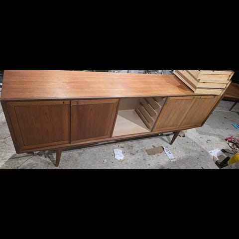 Nydelig skjenk med rammeverk i teak, to dører og tre skuffer.