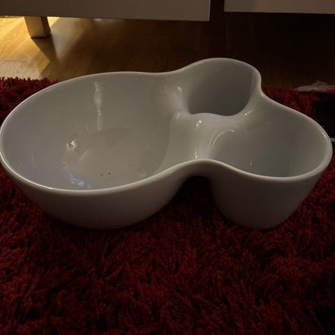 Har noe merker/striper i den største skålen jeg ikke får vekk. Hatt en plante stående i den. Fin til urter på kjøkken eller til oppbevaring i en gang, til chips og dipp eller annet.