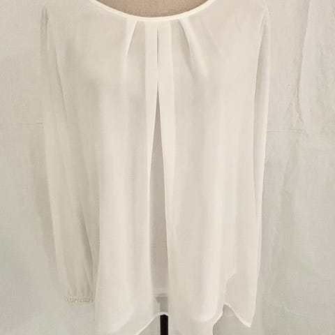 Hvit bomullsbluse fra Benetton i størrelse small. Flotte rynkedetaljer/ volanger i utringningen og ved ermene. Kragen kan brettes inn eller ut, avhengig av hvordan man ønsker den. Veldig lite brukt, men en liten flekk er nederst på venstre erme (se bilde), ellers ingen bruksmerker. Materiale 78% bomull, 19% polyamid, 3% elastan.