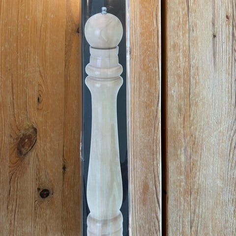 Trudeau One-Hand Pepper Mill, en pepperkvern som kan brukes med én hånd. Den er designet for å male både pepperkorn og havsalt.
