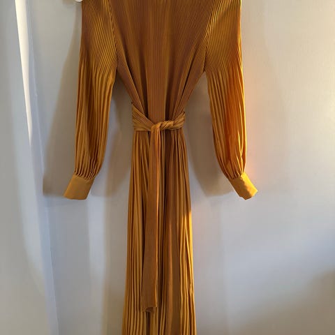 Satin Miami long kjole fra Cathrine Hammel i fargen «shiny blue». Str XS. Kjolen er i plissé med rund hals og nøkkelhull-åpning med knapp bak, ballongermer, mansjetter med kledde klassiske knapper, fôr og belte i samme tekstil. Kun brukt en gang i et bryllup.