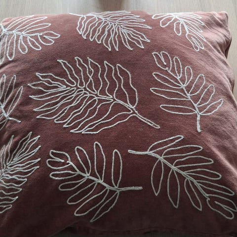 Pute «Stripe» fra Fine Little Day, 48×68 cm. Laget av en blandin av bomull og lin. Striper i en rustfarge.