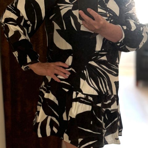 Pen svarthvit kjole i m, knyting i halsen, volanger ved håndledd og nederst på skjørtet. Viskose.