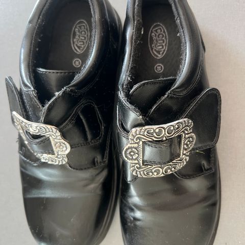 Ponny bunadsko selges str 31. Litt slitt på tuppen selv etter en gangs bruk, men sånn er det å være barn☺️ Behagelige og ha på. Kan sendes mot at kjøper betaler frakt
