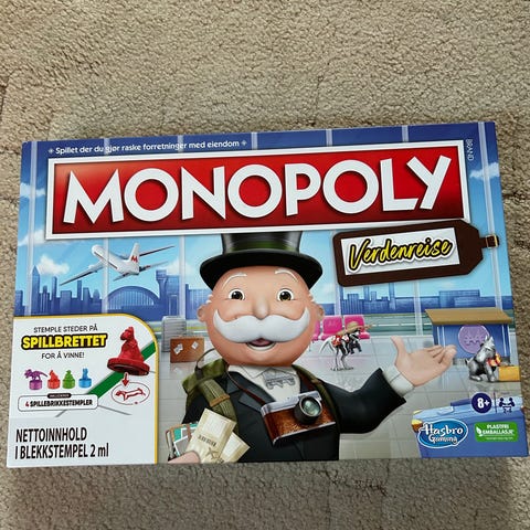 Monopoly Verdensutgave brettspill. Inkluderer brett, spillbrikker, kort og penger. Anbefalt for spillere fra 8 år og oppover. Perfekt for familie- og vennekvelder. Alt er der brukt 1 gang