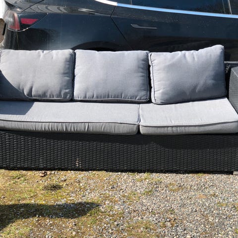 Koselige hagemøbler. Veldig behagelig sitte på. Litt skadet her og der se bilder. Trenger en god vask. Sommeren er ikke helt ferdig .🌞🌞🌞