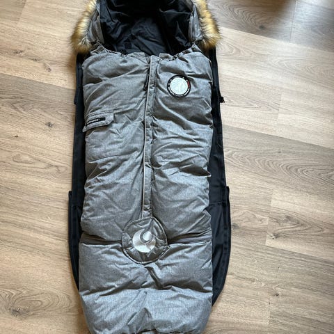 Nydelig vognpose til vinteren i dun. Med forlengerdel, avtagbar fuskepels - samt at man kan ta ut dyna som er i. Bilde med produktspesifikasjoner ligger i annonsen. Denne er grå. Jeg har også en annen annonse med samme pose i svart.