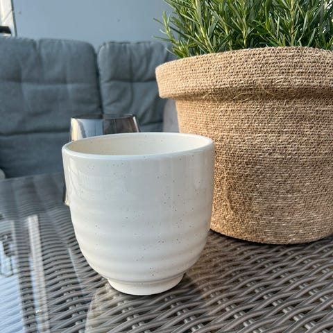Søt, liten blomsterpotte med perleblomster og fioler. Høyde