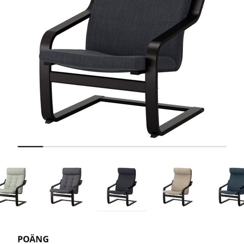Selger POÄNG lenestoler fra IKEA med sort ramme og sort stolpute.