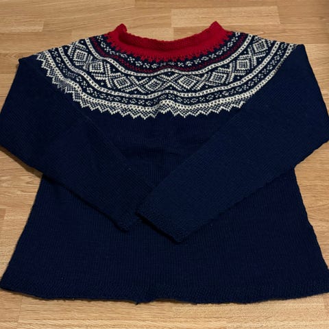 Mye brukt, så den har litt nupper, men genseren er forsatt fin, og nuppene kan jo fjernes. Blitt for liten desverre, og har ikke plass til å oppbevare klær som ikke blir brukt, da er det bedre at noen får nytte av den, er jo derfor den ble strikka 🥰
