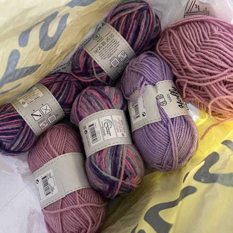 3 myke nøster SIRDAR snuggly confetti i lys blå med rosa, blå og gul ‘konfetti’ (se bilder).