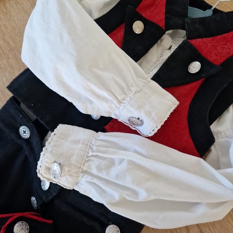 Festdrakt/ bunad til jente str. 98/104 . Stor i størrelsen. Hvit skjorte følger med, men denne er noe misfarget i halsen/kragen.