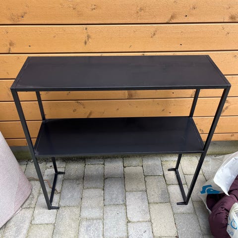 Flott hylle i svart farge metal, selges billig, den er stabil og har ingen feil eller nangler