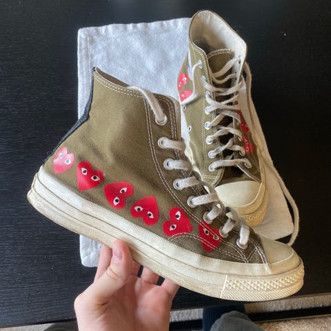 Selger et par CDG Play Converse low i hvit canvas med de ikoniske røde hjertene på siden. Klassisk og tidløst design som passer til det meste.