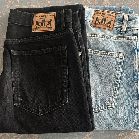 En grå og en svart jeans fra Sweet Skateboarding Company, kjøpt på Junkyard. Modell Sweet Tapered, begge i str. S. Selges samlet for 400,-