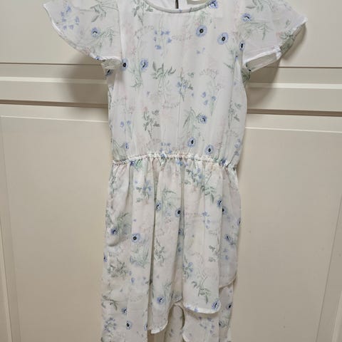 Selger en fin blå kjole med røde/hvite lyn og flotte detaljer. Passer til 140cm. Ta kontakt om du lurer på noe eller trenger flere bilder. 😊