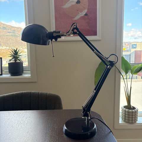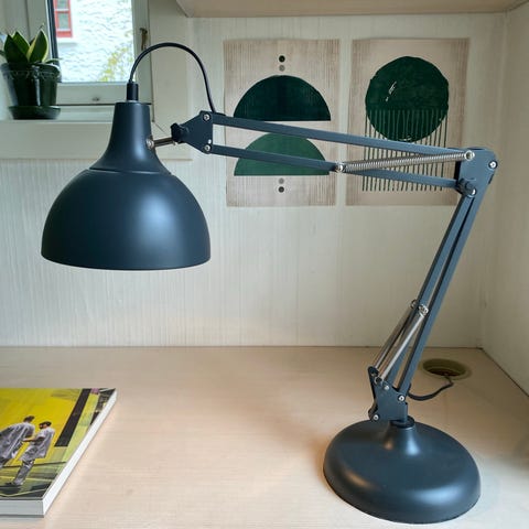 Blå bordlampe til kontor eller lignende. Må hentes.