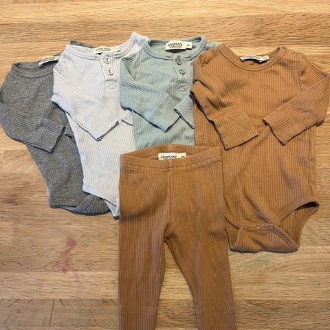 Vemodig selger jeg de nydeligste babyklær jeg har eid. Tre stk heldress og to stk body fra MarMar Copenhagen. Alt i str 50 (normale til romslig i str), bortsett fra dressen i pointelle som er i 56. Den mykeste kvalitet i modal og bomull. Brukt et par ganger hver og derfor i utmerket stand. Kun vasket med uparfymert vaskemiddel. Klar for en ny liten eier.