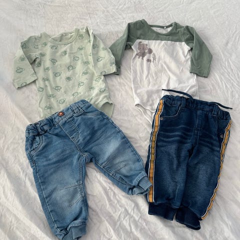 4 stk bukser , 2 stk body og julepysj. Body med hundemotiv fra Hust&Claire. Hummel body ikke brukt