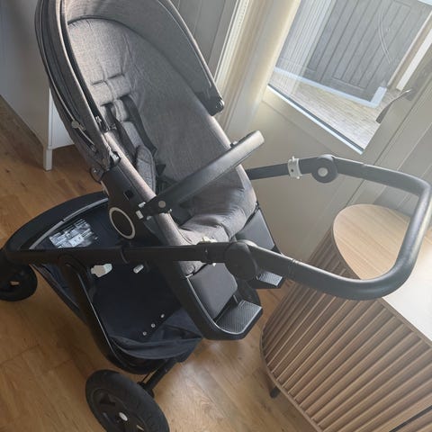 Selger vår flotte Stokke barnevogn i grå farge, i god stand. Vognen er både praktisk og komfortabel, perfekt for alle årstider.