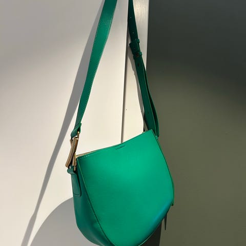 Selve vesken måler 32x25 cm. Den lange hanken kan justeres.