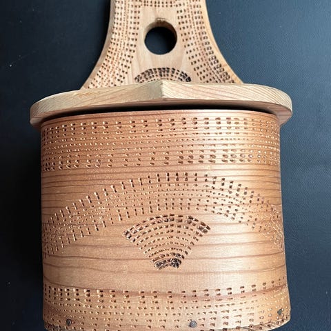 Høyde ca 4 cm, største diameter (over lokk) ca 2,8 cm. Hanken stikker ca 1,5 cm ut fra "seidelen"