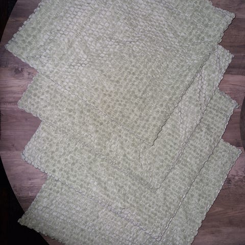 Består av 2 stk putetrekk med glidelås str 44×44 og 1 stk løper str 40×110 i grått slitesterkt stoff med mønster I sort og sølv. Merke Troya.
