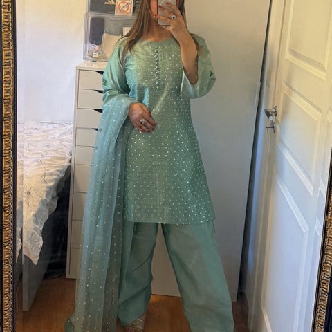 Lang shirt med broderi og mønstret dupatta i silke stoff (pakistansk raw silk)