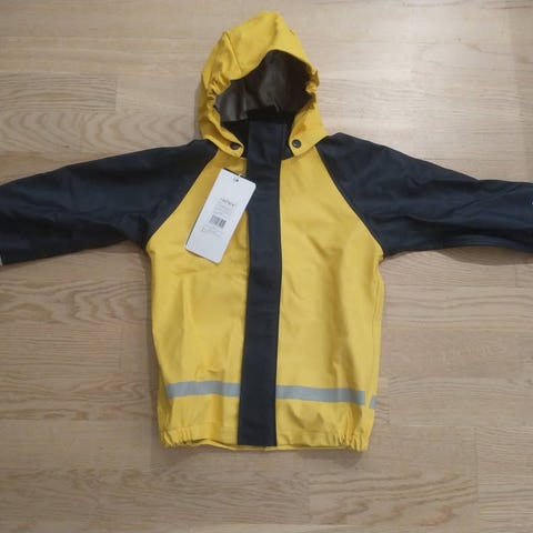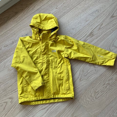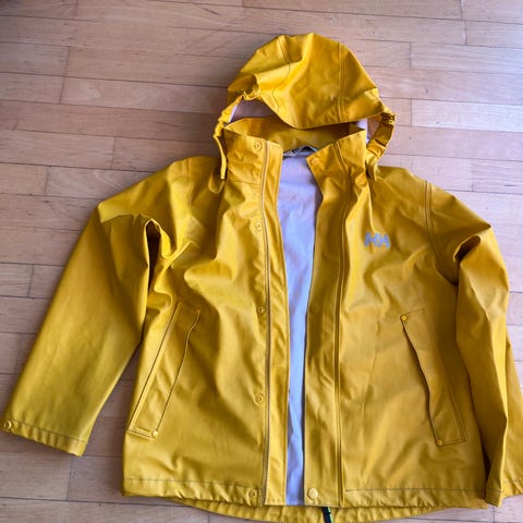Gul regnjakke i størrelse 140 / 10 år fra Helly Hansen. Avtagbar hette med trykknapper, trykknapper ved håndleggene for å kunne stramme, glidelås foran, justerbar strikk nederst. Lite brukt, litt misfarging på et erme. Se bildene