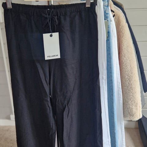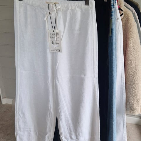 Lite brukt linbukse i 100%, lin. Størrelse 34 (XS) fra H&M i sort farge. Rett passform med to lommer i front og en lomme bak. Lukkes med glidelås og knapp, ekstra knapp medfølger.