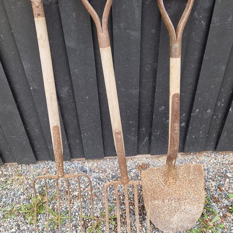 Det er rust på metalldelen. Spaden egner seg også som hagedekorasjon.