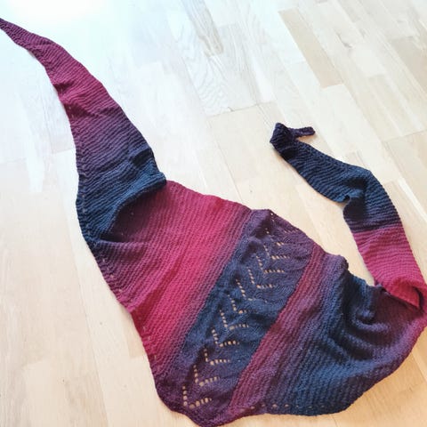 Gult sjal strikket i lammeull, med en hvit dekorkant.
