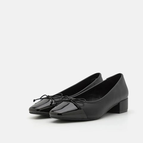 Svarte Pumps i semsket materiale med gullfarget lenke detalj.