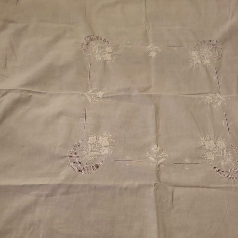 Fem broderte duker selges samlet. Fire stk i lin og en i bomull.