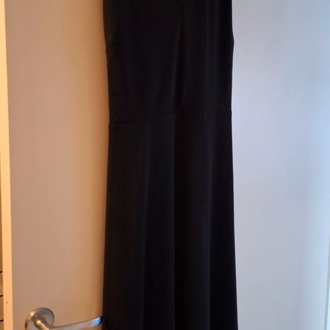 Mørkeblå kjole med sløyfe/ knyttebånd i halsen og knappestolpe. Lange armer med mansjett og knapper. Kjolen er ca. 96 cm lang målt fra nakke og ned.
