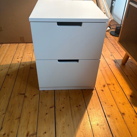 Selger et nattbord fra IKEA i svart og hvitt med to skuffer. Den er pent brukt men det er en del bruksmerker på toppen. Det siste bildet viser at nattbordet er feilmontert og det er derfor det ser slik ut. Man kan demontere og snu platen hvis man ønsker det.