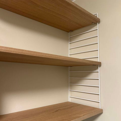 To stk hyller i hvitoljet eik. Hyllene har skjult innfestning som gjør at hyllene får et minimalistisk design.