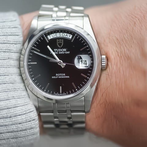 Selger en utrolig sjelden Tudor Prince Day Date 76214, 36mm med blå urskive og hvitt gull bezel. Den ser svart ut i lavt lys og lys blå i sollys.