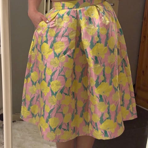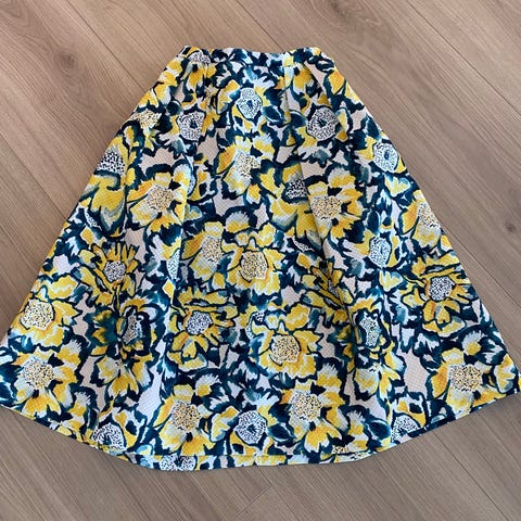 Skjørtet har en flott struktur i stoffet, plisserte folder i livet og et blomsterprint i gult, grønt og hvitt med sort detalj. Passer både til hverdags og fest. 🌸