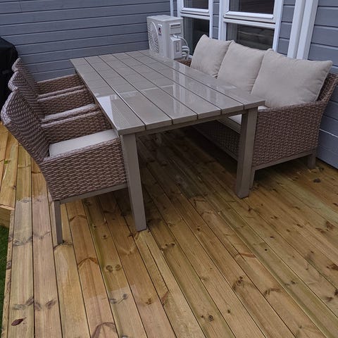 Selger et flott sett hagespisegruppe bestående av et spisebord, stor hjørnesofa og to praktiske spisekrakker. Spisegruppen verdi ny er 15.000kr, flatpakket og klar for henting. Møblene er helt ny