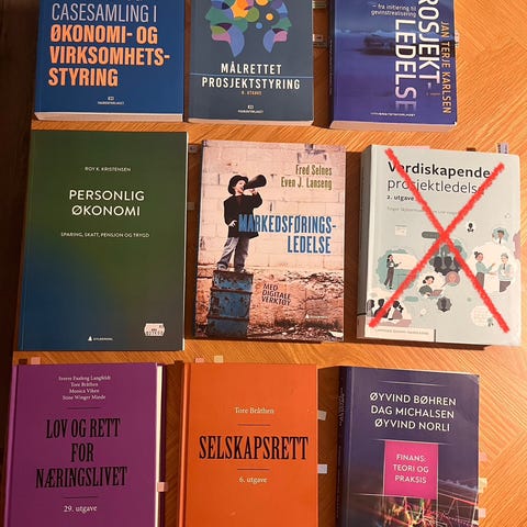 Selger desse 12 pensumbøkene fra første året økonomi og administrasjon på BI.