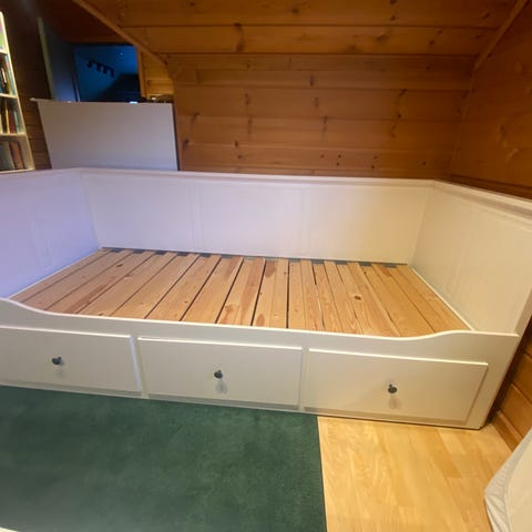 Sengen har to skuffer og kan trekkes ut til dobbelseng.